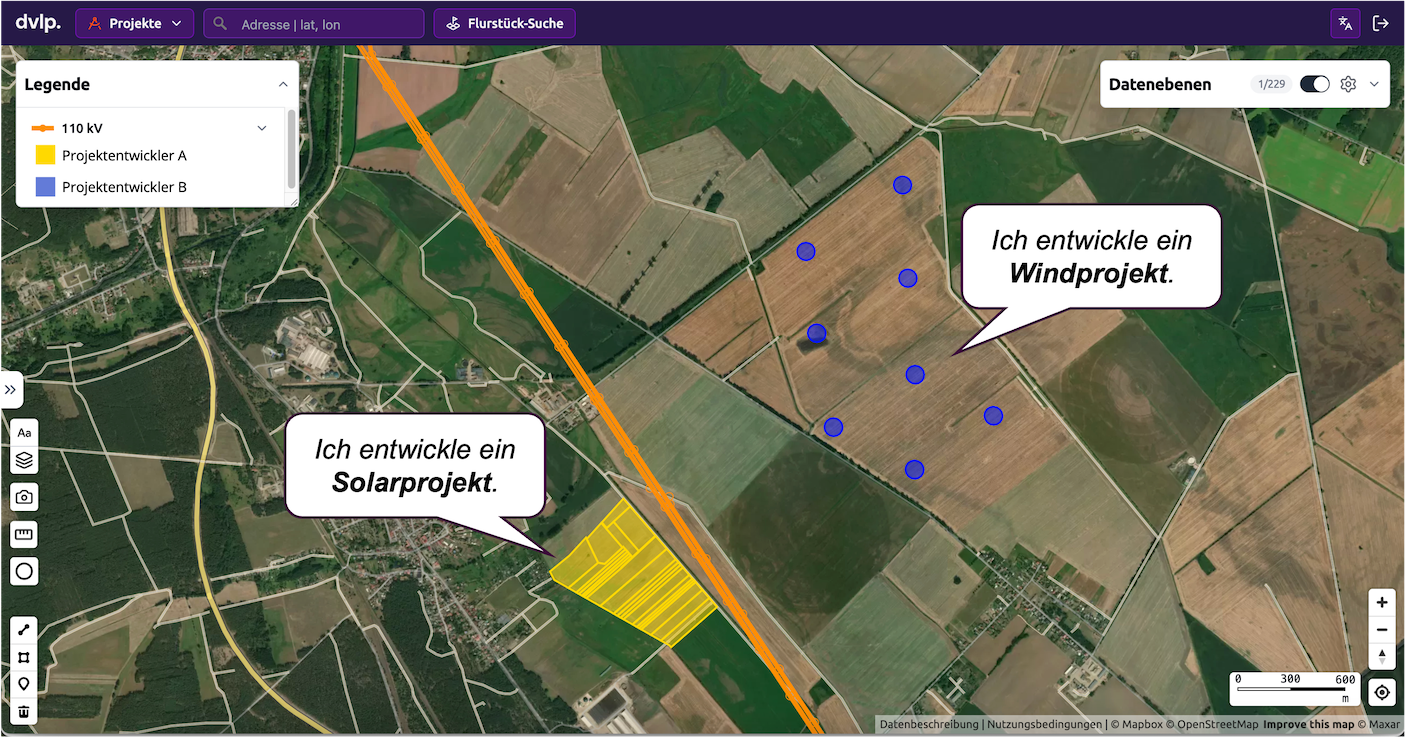 3. Partner finden: In der Realität werden hybride Projekte nicht immer aus einer Hand geplant, da sich die notwendige Expertise und Dauer für die Entwicklung von Solar-/Wind-/Batterieparks oder Rechenzentren unterscheiden. Um zu erkennen, ob eine Zusammenarbeit mit Partnern möglich ist, muss man wissen, ob anderen Entwickler unweit des eigenen Projekts aktiv sind. Dies ermöglicht die GridConnect-Funktion im dvlp web-GIS, mit der im Nachgang auch gezielt der Kontakt zu den möglichen Partner-Entwicklern aufgenommen werden kann.